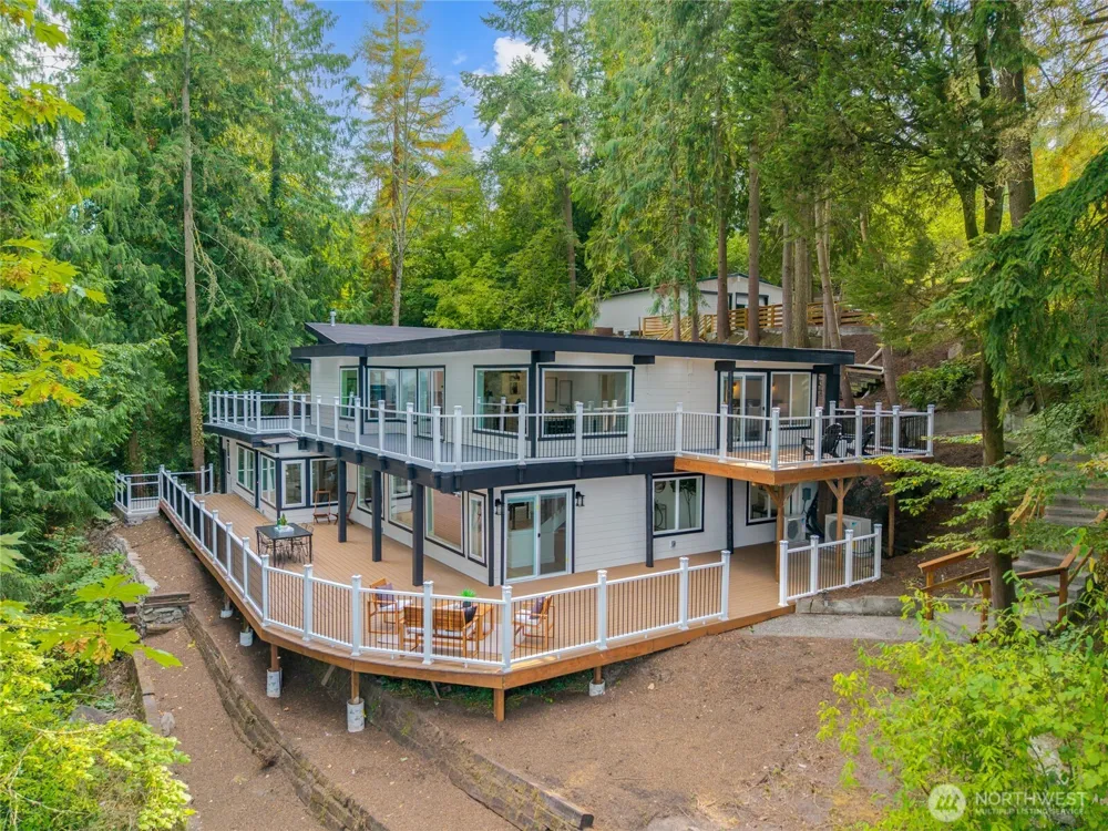 This Lake Forest Park masterpiece blends iconic contemporary architecture with a full-scale luxury renovation. Soaring ceilings, massive windows & a striking fireplace showcase Lake WA views from both levels.Featuring 5 bedrooms, 4 full baths, and 2 stunning kitchens—one on each level—finished with curated designer touches throughout. Your private forest retreat boasts fruit trees, multi-level decks, and endless space to entertain.Enjoy a 2-car detached garage plus ample guest parking. Lower level offers a huge bonus room and flexible layout—perfect for multi-gen living or hosting in style. New roof, high-end finishes, move-in ready—just minutes to Lake WA, Burke-Gilman Trail, parks & top schools.Space. Style. Views. This one has it all!