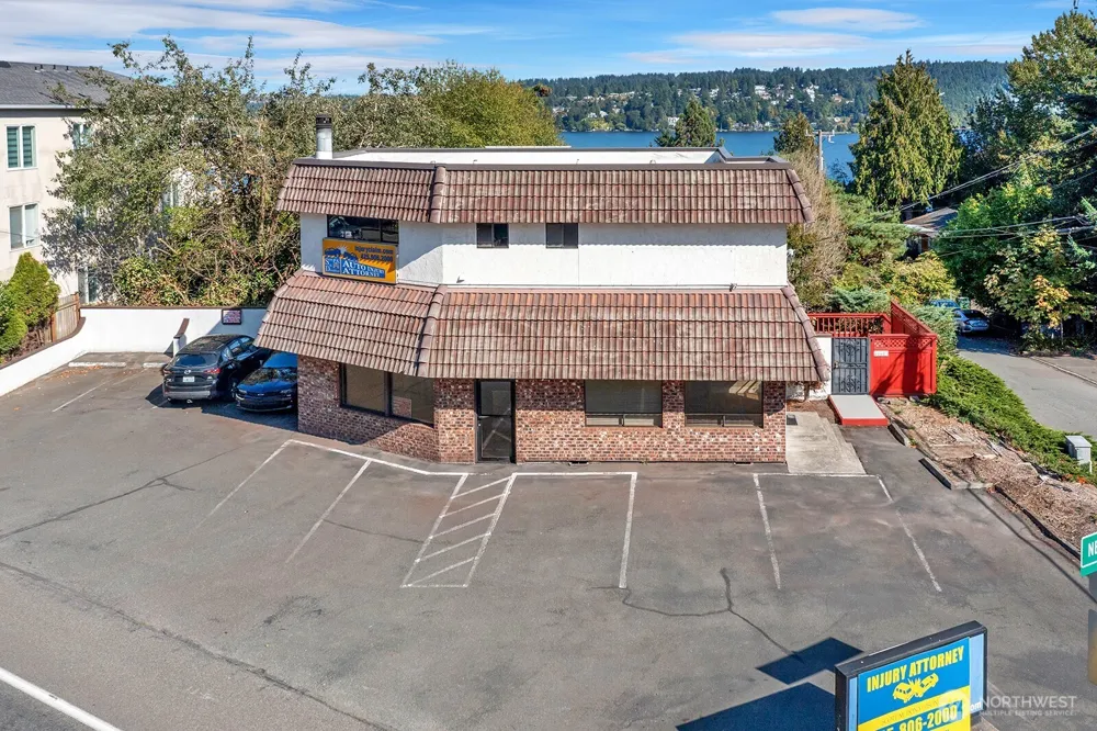 Spacious 2-bed 1-bath upper unit with Lake Washington views, atop a versatile 944 sq ft office space with 1/2-bath. Zoned RM-900 for multi-family redevelopment, subject to city approval, with a conditional use permit for neighborhood office. Prime 4,793 sq ft corner lot on Bothell Way NE with strategic signage for exposure. New roof in 2016, new engineered hardwood floors, newer Trex patio, all new SS appliances in 2019, 9 parking spots, and 2 extra storage units. Upper unit rented until January 2026. Enjoy serene lake views from the spacious upper deck. Don’t miss this rare opportunity. Buyer to verify all zoning and development potential with City of Lake Forest Park. Please do not disturb tenants.