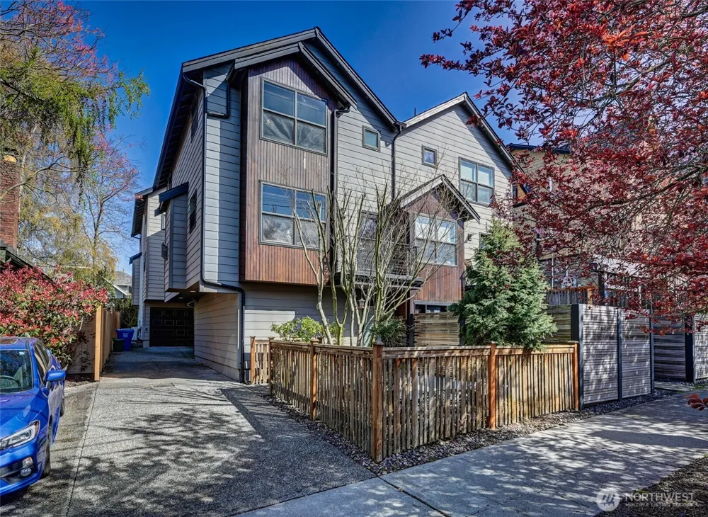 This beautiful townhome on a quiet street in vibrant Wallingford boasts a thoughtfully designed floorplan & sleek modern finishes. Main level features a large kitchen w/ island for entertaining, extra wide and bright living room, space for dining table and a ½ bath. Two ensuites on upper level w/ vaulted ceilings + skylight for natural light. Southern exposure balcony and fully fenced yard at entry with a patio, for gardening or sitting down for a cup of coffee after a day’s work. 1-car garage, radiant heating + ceiling fans for comfort, quartz countertops, gas cooktop, new interior paint. With a 97 walk score, it’s one block away from QFC, cafes, restaurants and pubs. Meridian Playground and Wallingford Farmers Market at doorstep.