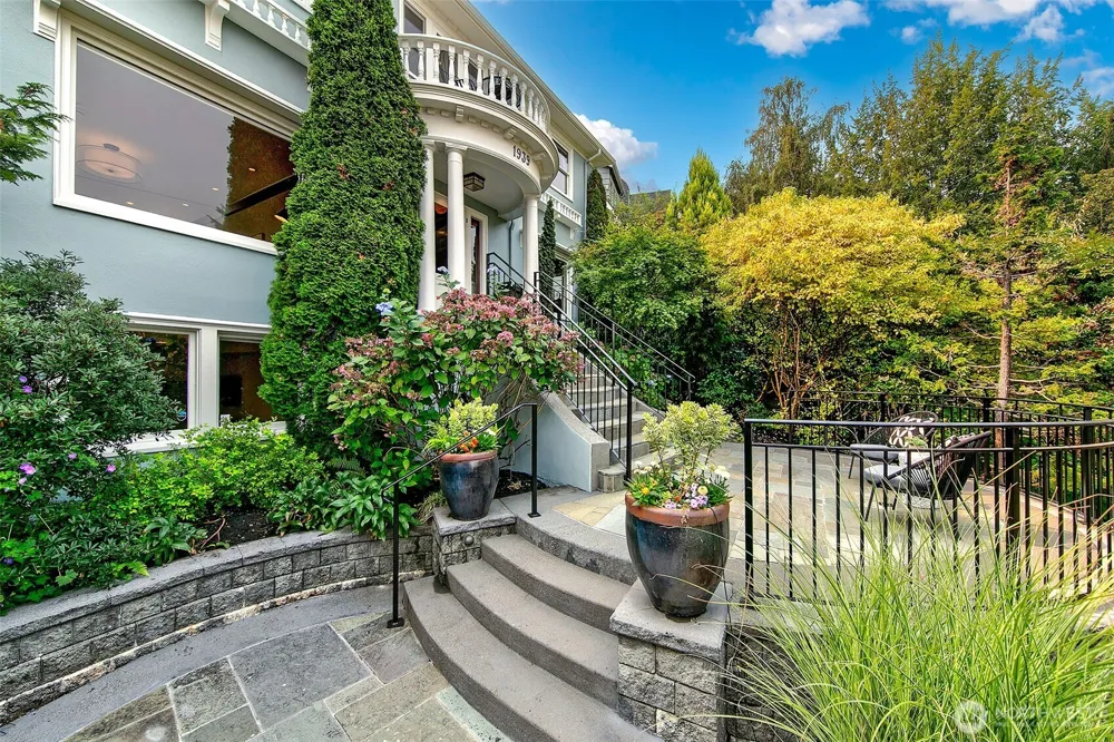 Perfectly positioned on the north end of Capitol Hill, this 1926 Colonial offers front-row views of the lake, Mt. Baker, and the Cascade range. Inside, rooms connect with ease to balconies, patios, and a fully fenced backyard. Upstairs, three bedrooms and two baths include a primary suite with a private balcony—an ideal spot for morning coffee or sunset evenings. The kitchen, has a built-in banquette and looks onto the garden to invite lingering meals, while the lower level provides a spacious family room, guest quarters, laundry, and storage. With Interlaken Park at your doorstep, and Volunteer Park 4 blocks west, city and nature unite. Alley garage parking and coveted location complete the story of this home with views from every level.