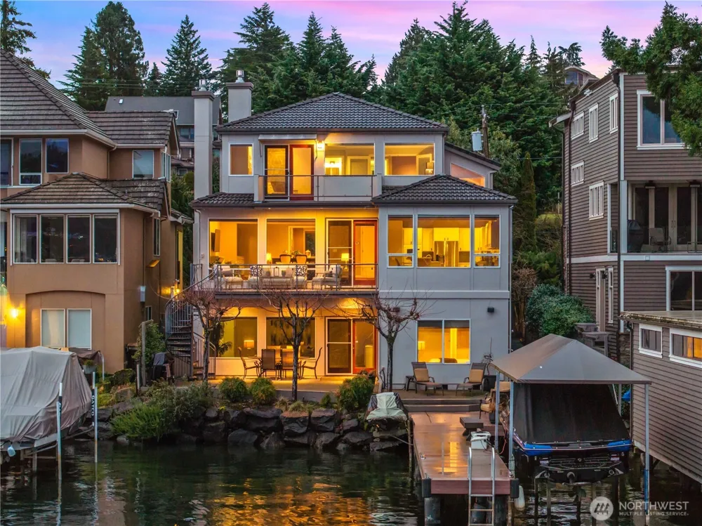 Every moment is choreographed by water and light in this west-facing Lake Washington retreat, where golden sunsets dance across the waterfront. Expansive windows frame sweeping views while the main floor deck invites you to savor the magic of each evening. A private dock, boat and jet ski lifts, and a hot tub foster active waterfront living. The primary suite spans the entire upper floor, remodeled in 2023 with a gas fireplace, spa-like bath, and unobstructed lake vistas. Enjoy morning coffee as eagles soar overhead and herons survey the shoreline. An indoor-outdoor sound system sets the perfect backdrop. Nestled on a private lane near the scenic trail to Gene Coulon Park, this home seamlessly blends natural beauty with urban convenience.