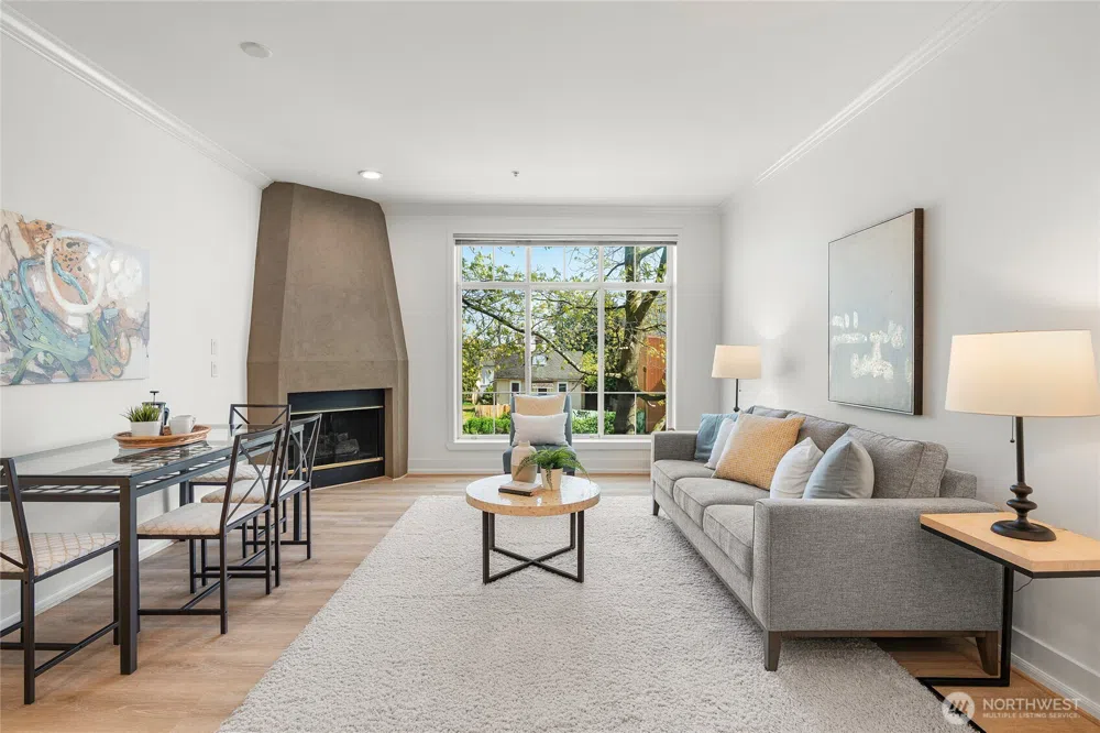 Welcome home to an open floor plan with soaring ceilings, a cozy gas fireplace, and abundant natural light, this home combines comfort and convenience. The modern kitchen is equipped with stainless steel appliances, granite countertops, and ample storage space—ideal for everyday living and entertaining. Enjoy your wrap-around deck, or take in panoramic views of Lake Union and the downtown skyline from the community rooftop deck. Located in a secure, pet-friendly building with elevator access and a strong HOA. No rental cap, offers excellent investment potential. Unbeatable location; minutes to DT Seattle, Fremont.