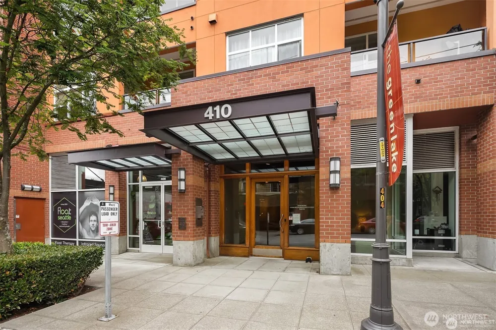 Live just steps from Green Lake in this bright and inviting 1-bedroom, 1-bath condo on the 5th floor, complete with a private balcony and stunning views of Mt. Rainier. This secure building offers gated garage parking and a dedicated storage room. Inside, enjoy an open-concept layout with abundant natural light, a kitchen with dining space, and a cozy living room with a gas fireplace and beautiful laminate flooring. The spacious bedroom features a walk-in closet and direct access to the full bath. A dedicated office nook makes working from home a breeze. In-unit washer and dryer included for your convenience.