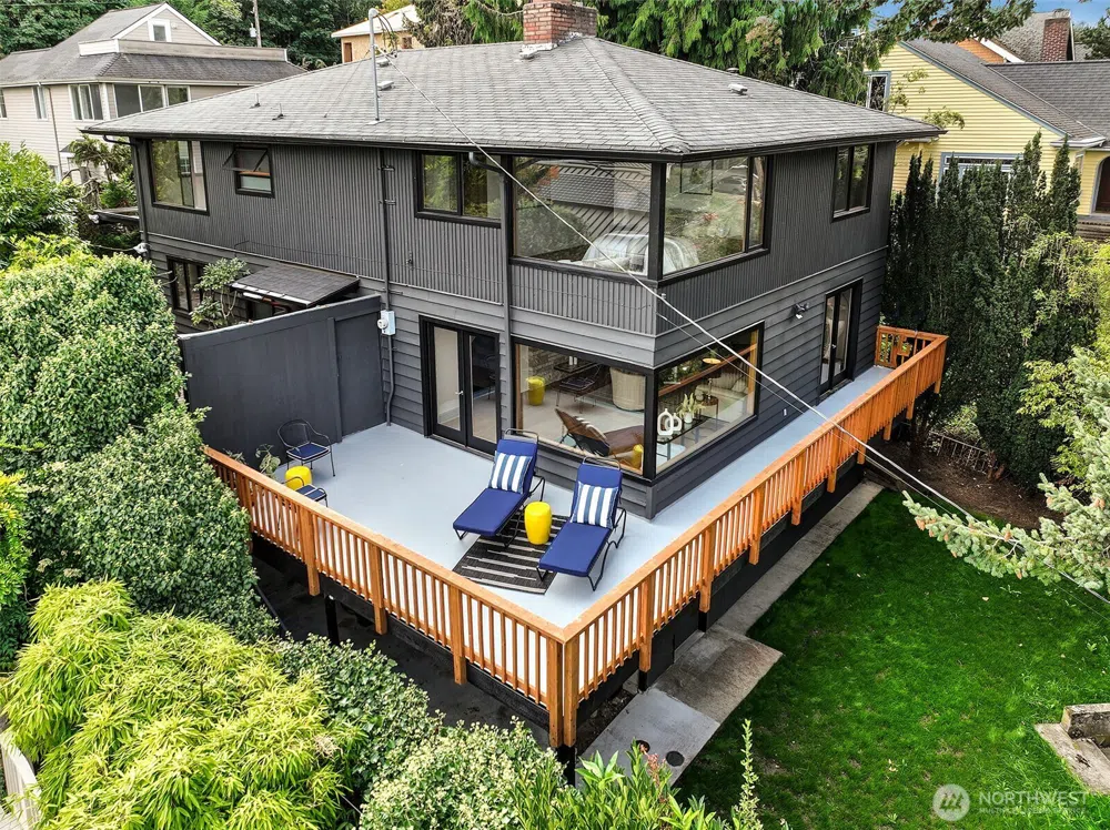 Serene views on Phinney Ridge! One may associate the approach to a cabin in the woods, yet here it stands within the beauty and convenience of Seattle's storied Phinney Ridge neighborhood. The canopy of pines opens to an expansive 4,080sf home positioned peacefully on a 7,500sf lot overlooking Green Lake and Cascade Mtns. Full exterior paint job, rebuilt entry walkway, carport and driveway are among the many updates. The proper foyer leads guests into a spacious living room with two sets of french doors out to the newly repaired wrap around deck. Original hardwood floors tie the kitchen with eating space and formal dining room. Top floor includes all 3 bdrms + primary suite while the lower level sparks visions of multi-living functionality.