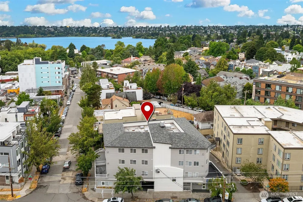 Embrace the lifestyle. Top-floor, light-filled 2 bedroom, 2 bathroom Green Lake condo with vaulted ceilings, engineered hardwoods, and a spacious layout. Step out onto your private, oversized deck-perfect for relaxing, entertaining, or soaking in the view year-round. The updated kitchen features quartz countertops, white tile backsplash, and stainless steel appliances. The bright primary suite boasts a large walk-in closet and full bath; the second bedroom is ideal for guests or a home office. Secure garage parking, convenient storage unit, and city/mountain views. Only two blocks to Green Lake with all of its cafes, bistros, shops, and the scenic 2.8 mile loop trail. Urban living at its best!
